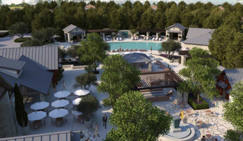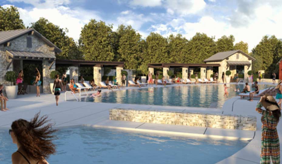 The expansive exterior grounds of The Lodge at Riverstone will feature a resort-style pool and a children’s pool as well as an array of amenities including comfortable gathering places and an outdoor bar with firepits.