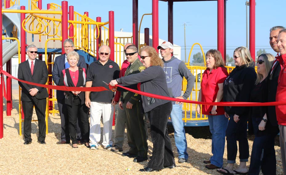 Teachers and school district officials celebrate the ribbon-cutting ceremony for a brand-new playground at Sierra View Elementary. A $10,000 donation from the owners of Riverstone Farms, an affiliate of Riverstone Development, contributed towards the new playground’s construction costs.